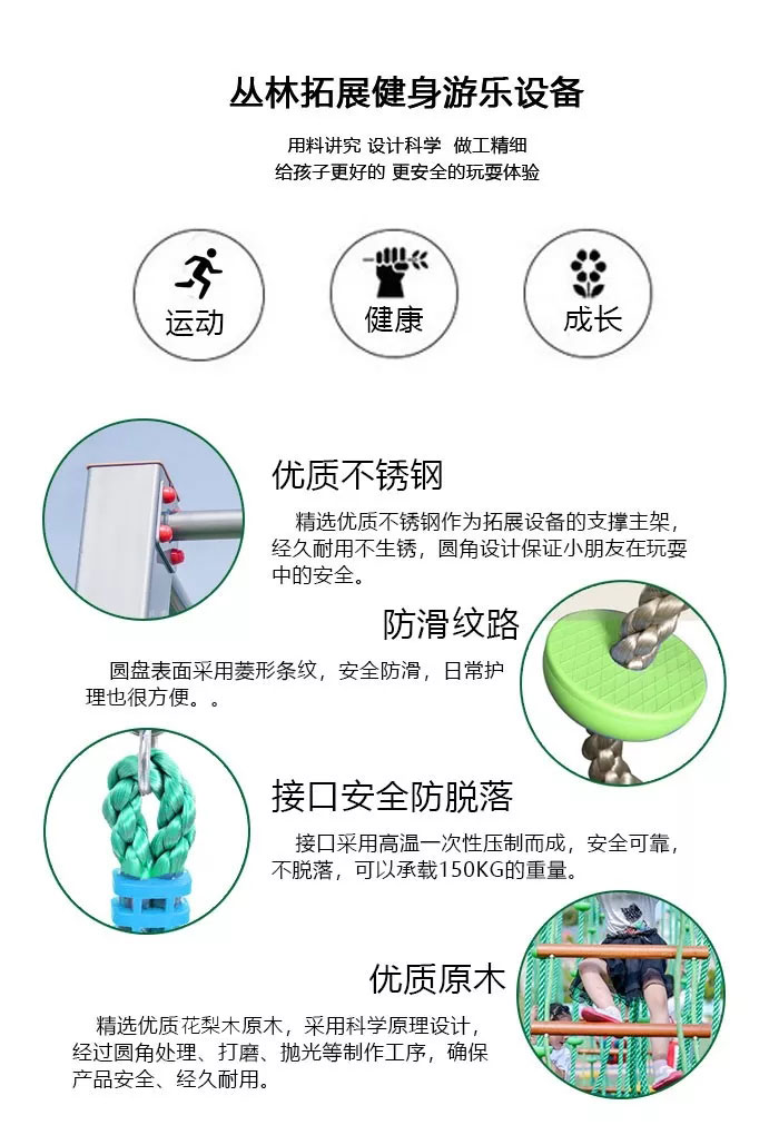 丛林拓展游乐设备是集爬绳、葫芦盘爬、秋千绳、木头爬、吊盘秋千、腰鼓爬绳、吊环、吊杆、网座秋千、钻圈爬等功能为一体的综合性游乐设备,能够满足现有幼儿园大部分的游乐、拓展、教学任务,是作为幼儿园配套设施不可缺少的一部分。