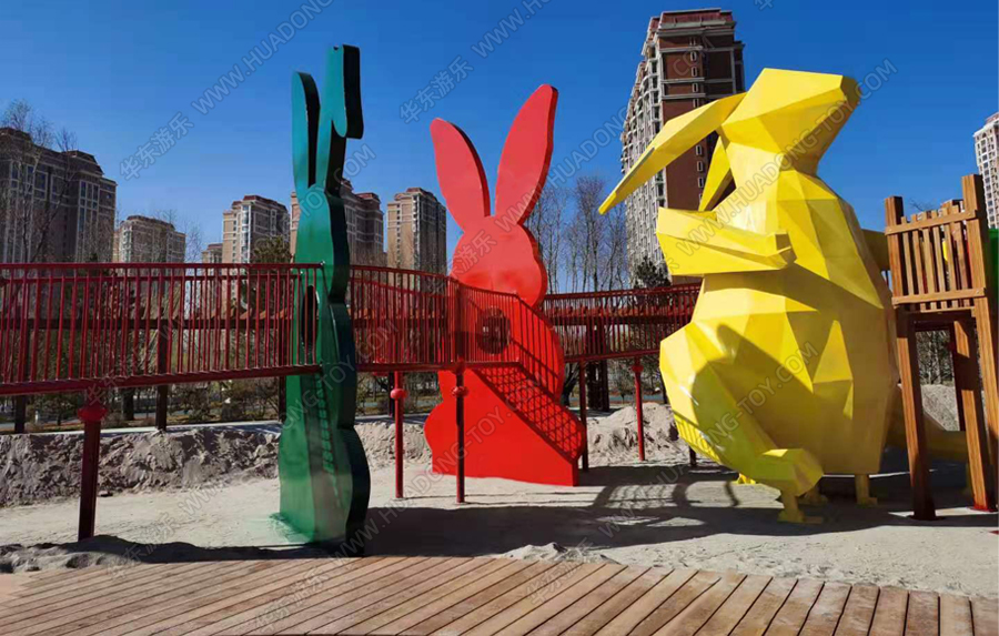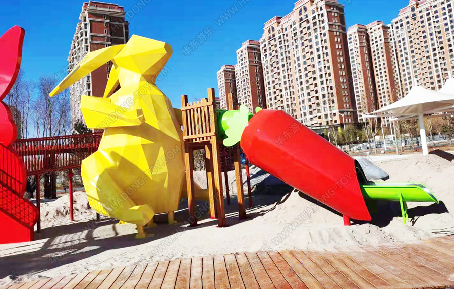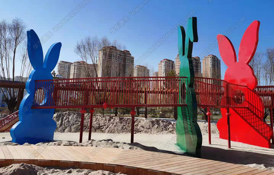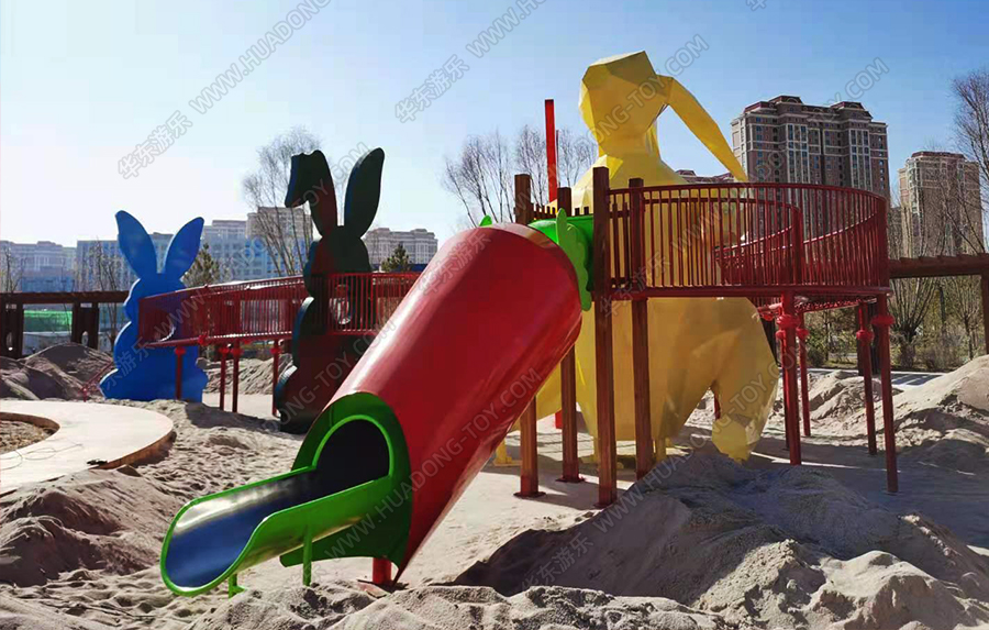 兔子乐园非标定制是完美wm365体育游乐根据客户场地需求以及结合当地实际情况而设计的兔子主题乐园的游乐场,该游乐园具有主题鲜明,设计新颖,功能多样等特点,设计了滑梯组合、爬网、钻洞、沙池等游乐设备。