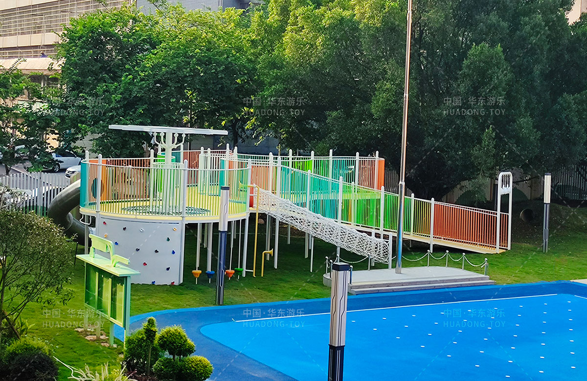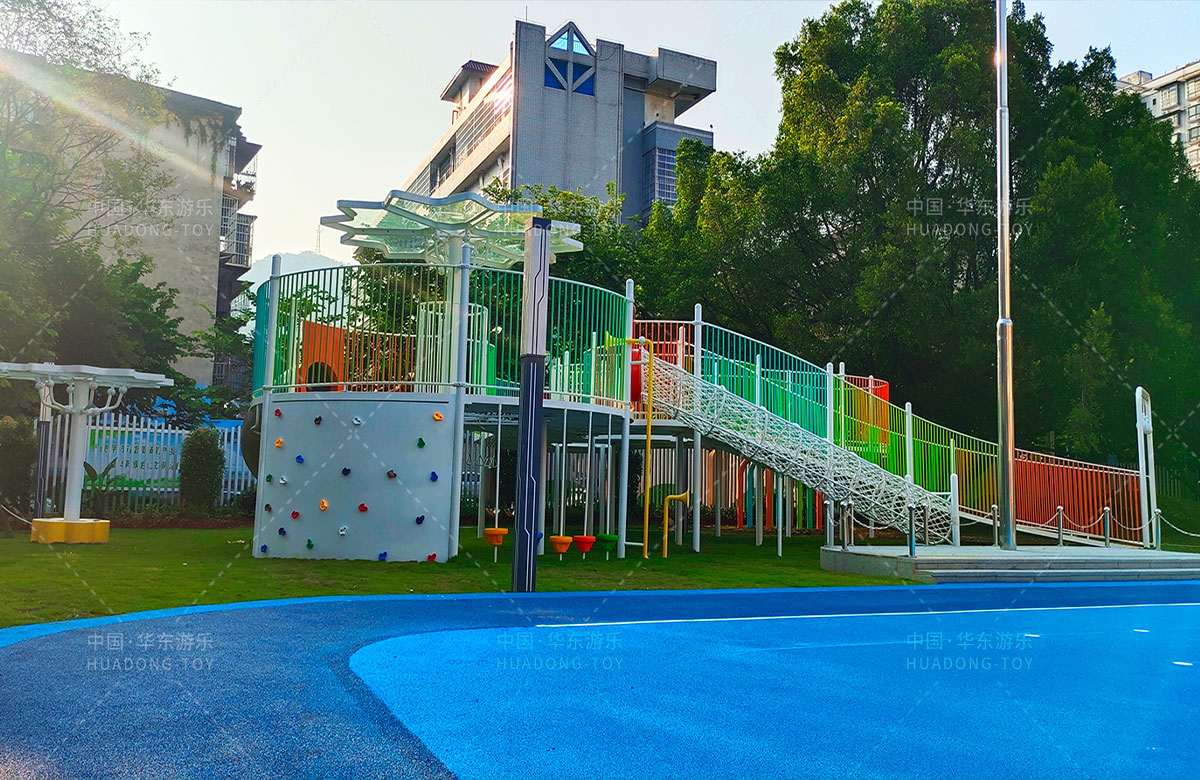 三明市实验幼儿园 选用的是完美wm365体育游乐自主研发和设计的非标定制系列的组合游乐设备,是一款具备了攀爬网、空中网桥、攀爬墙、儿童秋千、大型滑筒、平衡吊环、彩虹桥等功能,除此之外还设置了树形休闲厅、木制小桥等游乐设备,让孩子们有一个健康的成长环境,也为老师的教学提供了保障。